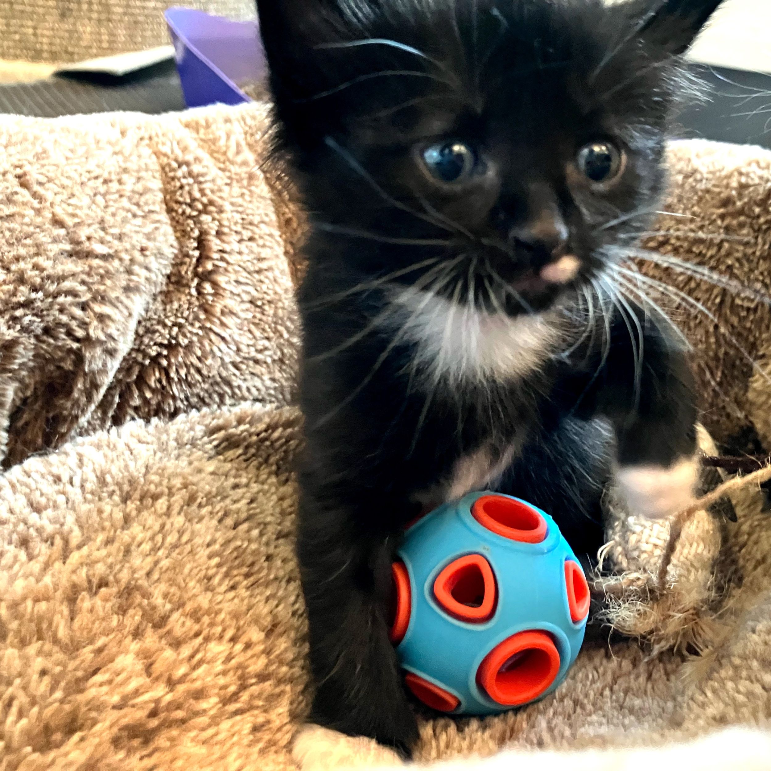 Cute and dapper tuxedo, Cornelle, percolates with kitten personality, spirit and spunk. He loves being held, petted and snuggled by his foster mom as much as he loves high jumping on the cat tree, stepping in the shower and standing on her book when she’s reading! Fully litter box trained, he’ll fill your heart and days with love and laughter if you make this cutie yours fur-ever.