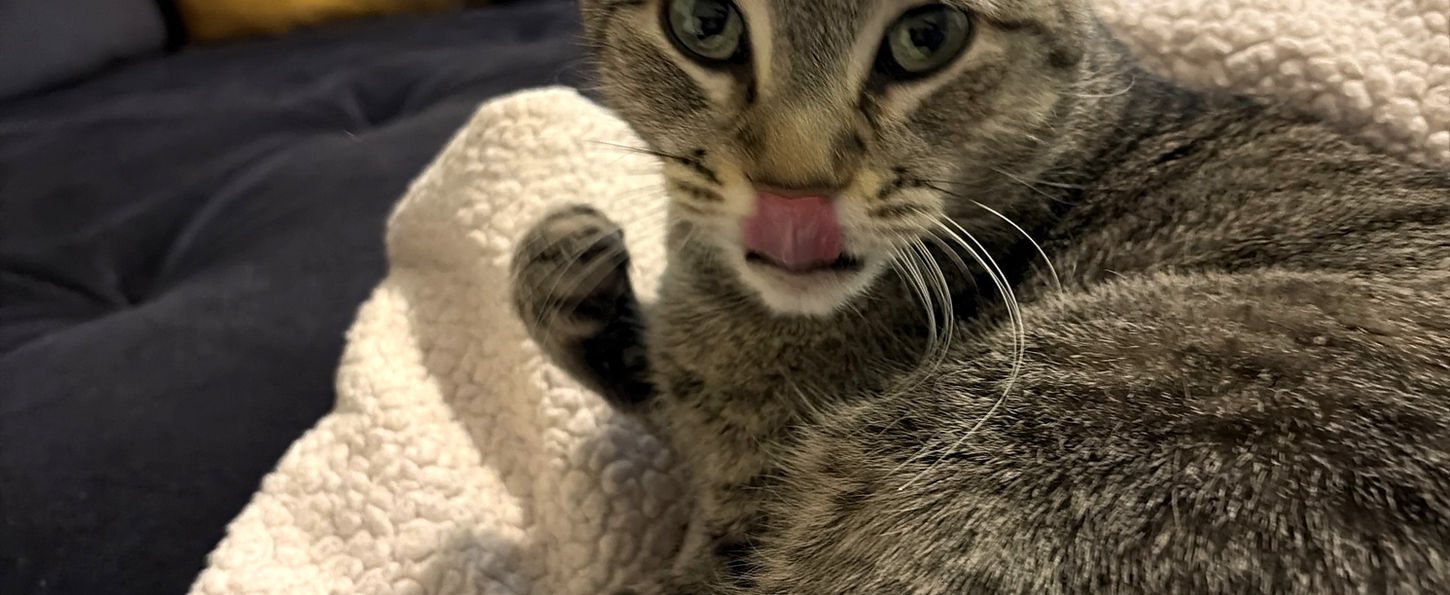 Mimi has made the most of life in her foster home. Sweet and sociable, cuddly and curious, she loves being near her foster mom, curling up on her lap and following her from room to room during the day – with random bursts of wanting to play. She also loves sitting on her foster mom’s lap while she watches TV and then sleeping soundly through the night in bed beside her. Fond of her cat tree, very food motivated and fully litter box trained, Mimi, who adores attention, hopes to find it fur-ever in an especially loving adoptive home.