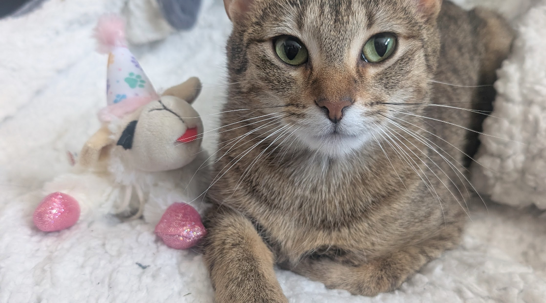 Sizzling with sweetness and personality, Svetlana may be small in size but she’s LARGE in love! As smart as she is social, this precious little purring machine LOVES people and responds to her pet name, Lady Mew Mew. She not only greets her fosters with some “hello” mews when she sees them, she gives new meaning to the term “lap cat,” eagerly lapping up their snuggles, cuddles and pets before following them around the house. She also loves her automated feather toy, doing zoomies with a crinkle toy or little springs and sitting on her perch to watch the birds outside. Wonderfully well mannered and fully litter box trained, Lady Mew Mew must reign supreme as the only loving kitty in her equally loving fur-ever home.